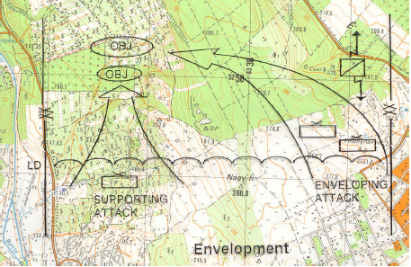 Az átkarolásnál feladat az átkarolás irányában ténykedő ellenséges erők lépésről lépésre történő megsemmisítése. Megkerülésnél a mélységbe kitűzött feladat teljesítése a meghatározó. A megkerülés során az arcból támadó főerőkkel harcászati, illetve hadműveleti együttműködés valósul meg. Tűzösszeköttetés köztük csak a gyalogsági fegyverek hatásos lőtávolságáig van. A beszivárgás harcászati szintű manőverforma, melyet gyalogosan, esetleg harcjárművel rejtve az ellenség védelmén keresztül hajtanak végre azzal a céllal, hogy kedvező helyzetet foglaljanak el az ellenség mögöttes területén. A beszivárgást a csapatok végrehajthatják felderítés, zavarkeltés, esetleg az ellenség védelmének mélységében fontos vezetési elem vagy tűzeszköz megsemmisítése érdekében. A beszivárgást rövidesen a főerők támadása kell, hogy kövesse. Az áttörés olyan manőverforma, amelyet akkor alkalmaznak, amikor a támadás során nincs lehetőség az ellenség védelmének átkarolására vagy megkerülésére. Az áttörés lényege, hogy a széles arcvonalon védelmet folytató ellenség peremvonala egy viszonylag keskeny szakaszára összpontosítják a főerőkifejtést, ahol jelentős helyi erőfölényt hoznak létre. Az áttörési szakaszon betörve a védelembe a támadást a szárnyak irányába, majd a mélységbe fejlesztik ki.